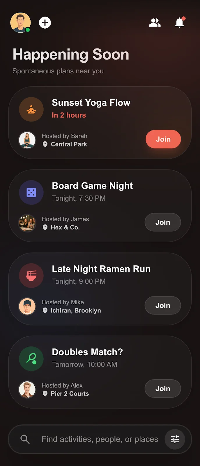 Skip the high-stakes "Who wants to hang out?" text. Simply signal what you're up4—coffee, a hike, or a drink—and let your friends join if they're free. If no one's around, no sweat.